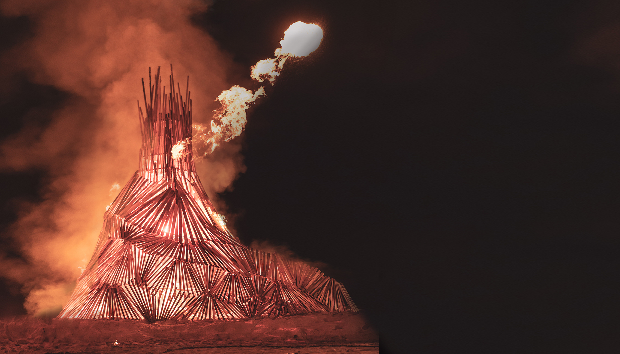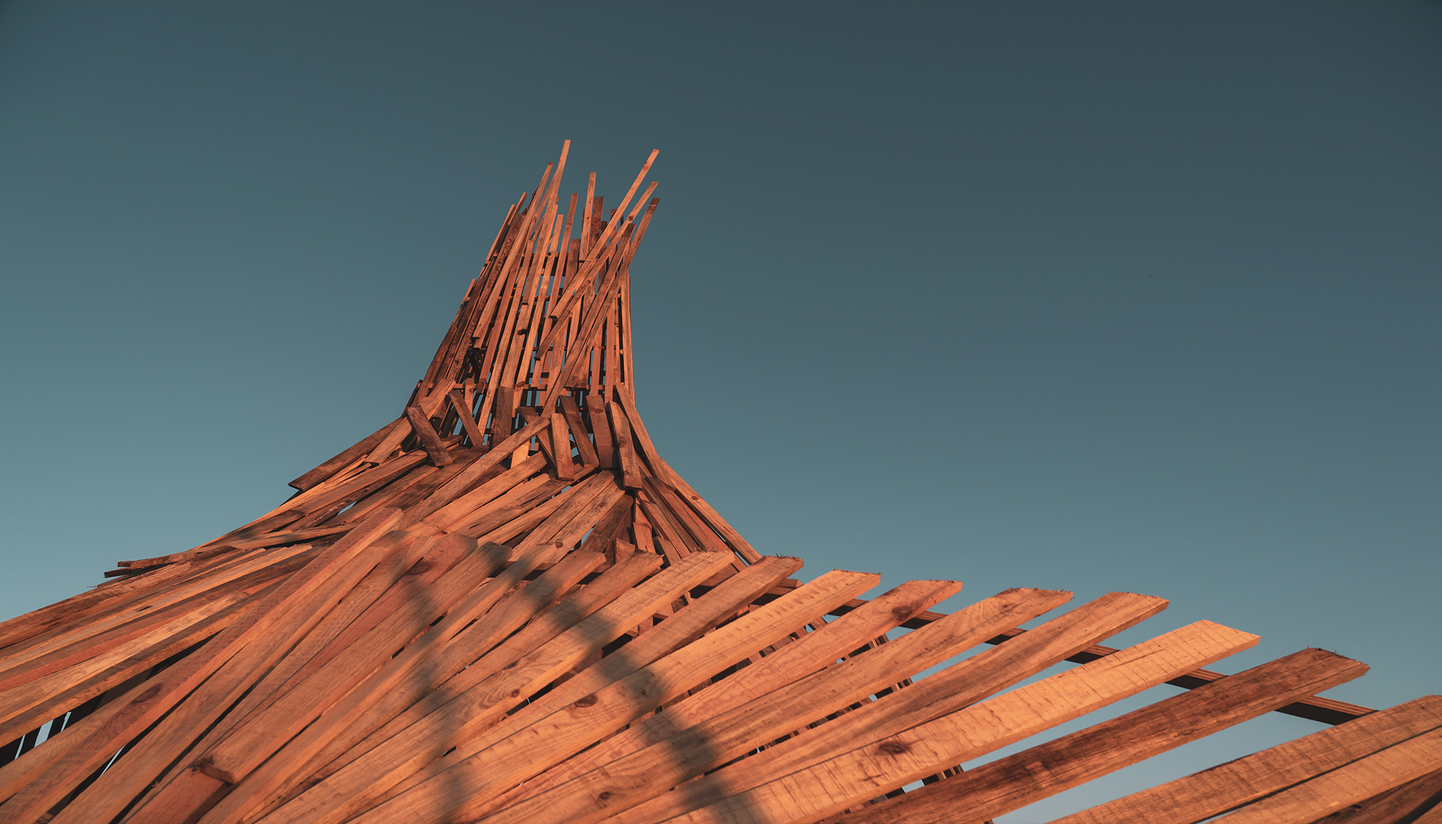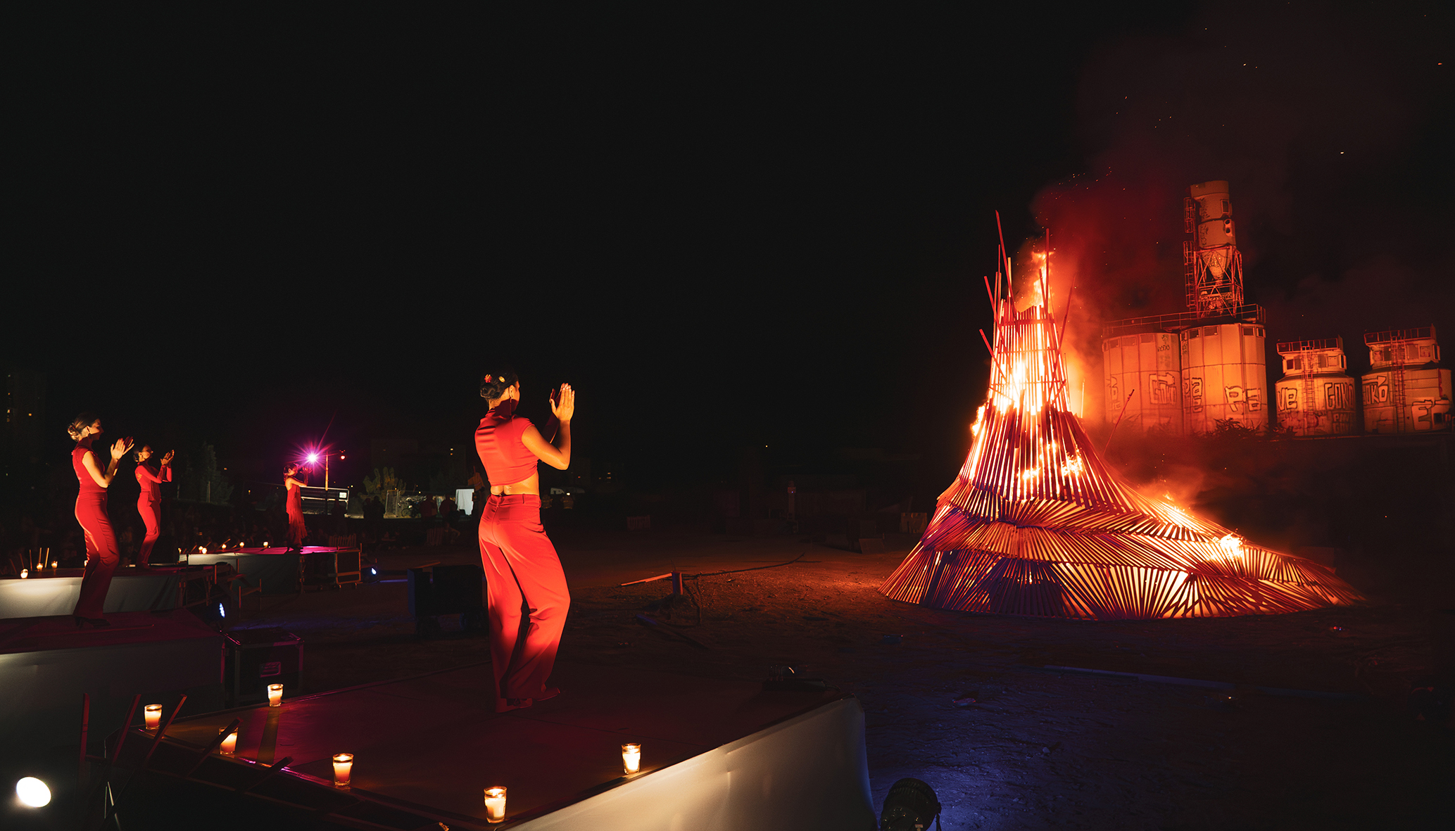 L’installation est une jupe de bois. Embrasée, elle crépite et danse au milieu des flammes, portée par un Boléro qui n’en finit plus de monter.