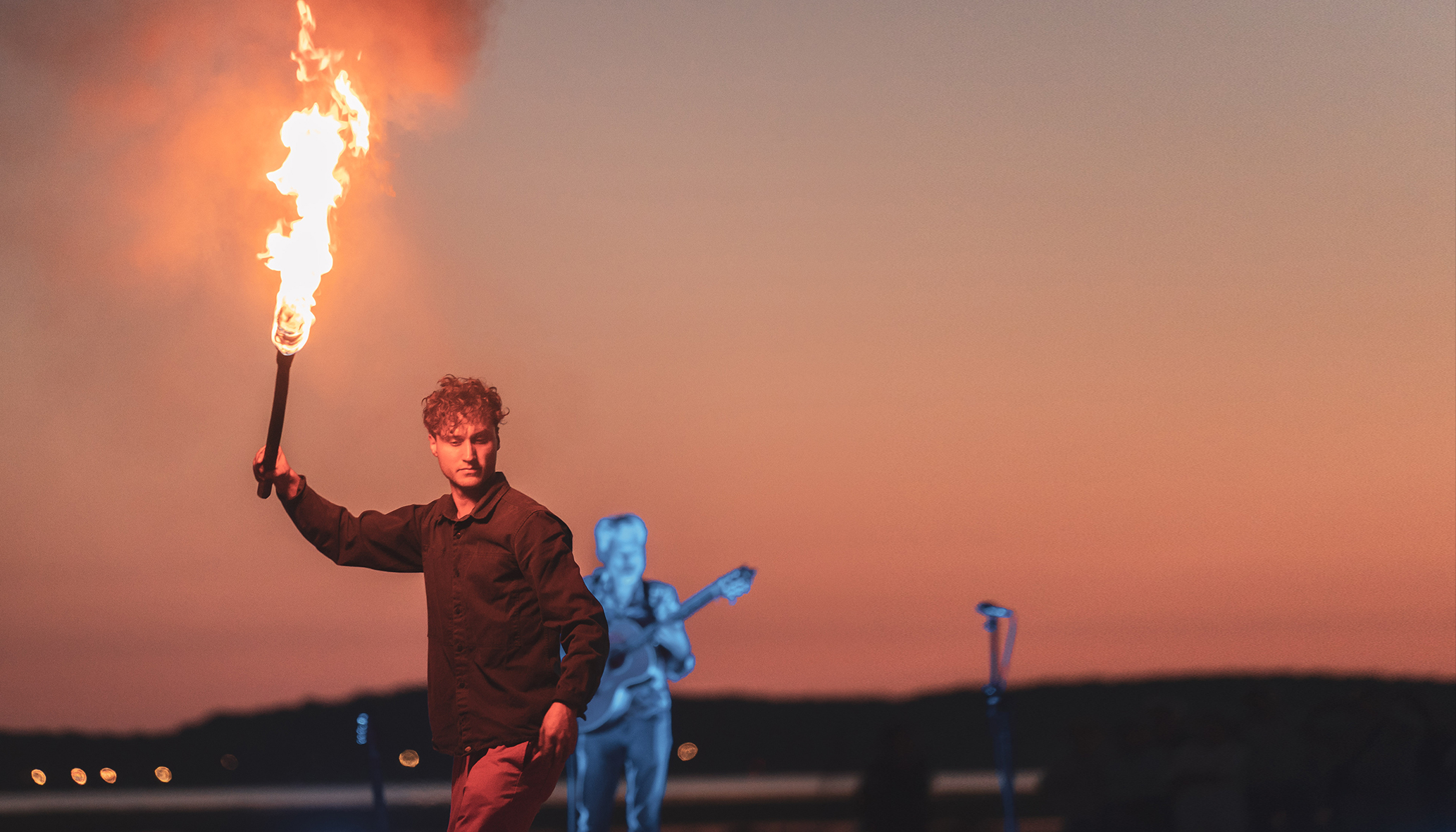 En scène, un musicien et un artificier, 4 danseurs et danseuses et une installation hors norme menés par une partition magistrale.